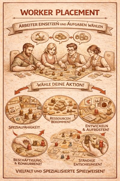 Worker Placement verbindet Ressourcenmanagement mit taktischer Interaktion und zählt zu den beliebtesten Strategiemechaniken.