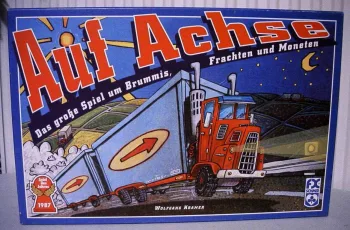 „Auf Achse“ bedeutet so viel wie „Unterwegs“ – ein passender Titel für dieses Spiel, das 1987 als „Spiel des Jahres“ ausgezeichnet wurde und bei dem die Spieler Ladungen mit Gütern in verschiedene deutsche und andere europäische Städte liefern. Durch das Ausspielen von Karten werden Angebots- und Nachfragestädte bestimmt, und die Spieler versuchen, durch gegenseitiges Bieten Lieferaufträge zu erhalten. Die Bewegung erfolgt durch Würfeln und das Verschieben kleiner gummierter Lastwagen auf einer abstrakten Karte, die zahlreiche miteinander verbundene Straßen und Städte in Deutschland und den Nachbarländern darstellt.