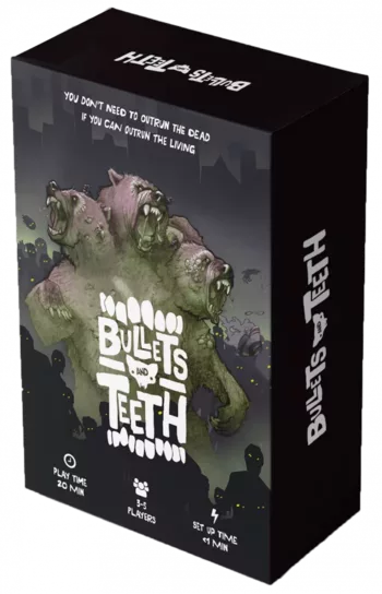 Entkomme einer Horde von Zombie-Bestien und überlebe gleichzeitig die Verräterei deiner Freunde. Setze clevere Kombinationen aus Waffen, Fallen und Vorräten ein, um um jeden Preis am Leben zu bleiben. Bullets and Teeth ist ein Überlebensspiel, in dem die Spieler vor einer immer größer werdenden Horde von Untoten fliehen. Während des Spiels geben die Spieler die Köderkarte weiter, um anzuzeigen, wer gegen die wachsende Horde kämpfen muss. Die Spieler setzen sich gegenseitig mit Fallen in Gefahr, während der Köder mehrere Karten in Kombination ausspielt, um sich selbst auf Kosten der anderen zu retten. In Bullets and Teeth musst du nicht den Toten entkommen, wenn du den Lebenden entkommen kannst.