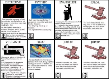 Im Mittelpunkt des Spiels steht jemand, der als Detektiv versucht, alle Schuldigen zu jagen, bevor sie alle ermorden. Wenn die Schuldigen versuchen, den Detektiv zu töten, beginnt die letzte Runde des Spiels. Die Bürger können weiterhin dafür stimmen, Verbrecher zu verurteilen, aber der Detektiv hat seine zuverlässige Waffe und kann Bürger nach Belieben erschießen! Aber er muss vorsichtig sein, denn wenn er einen unschuldigen Spieler tötet, ist das Spiel vorbei und die Schuldigen gewinnen! Es gibt auch mehrere Rollen, die den Unschuldigen (Helden, Anwälte, Selbstjustizler usw.) und den Schuldigen (Serienmörder, Pyromanen, korrupte Polizisten usw.) helfen. Alle Rollen sind geheim, also vertraue deinen Freunden nicht, denn sie könnten versuchen, dich umbringen zu lassen!