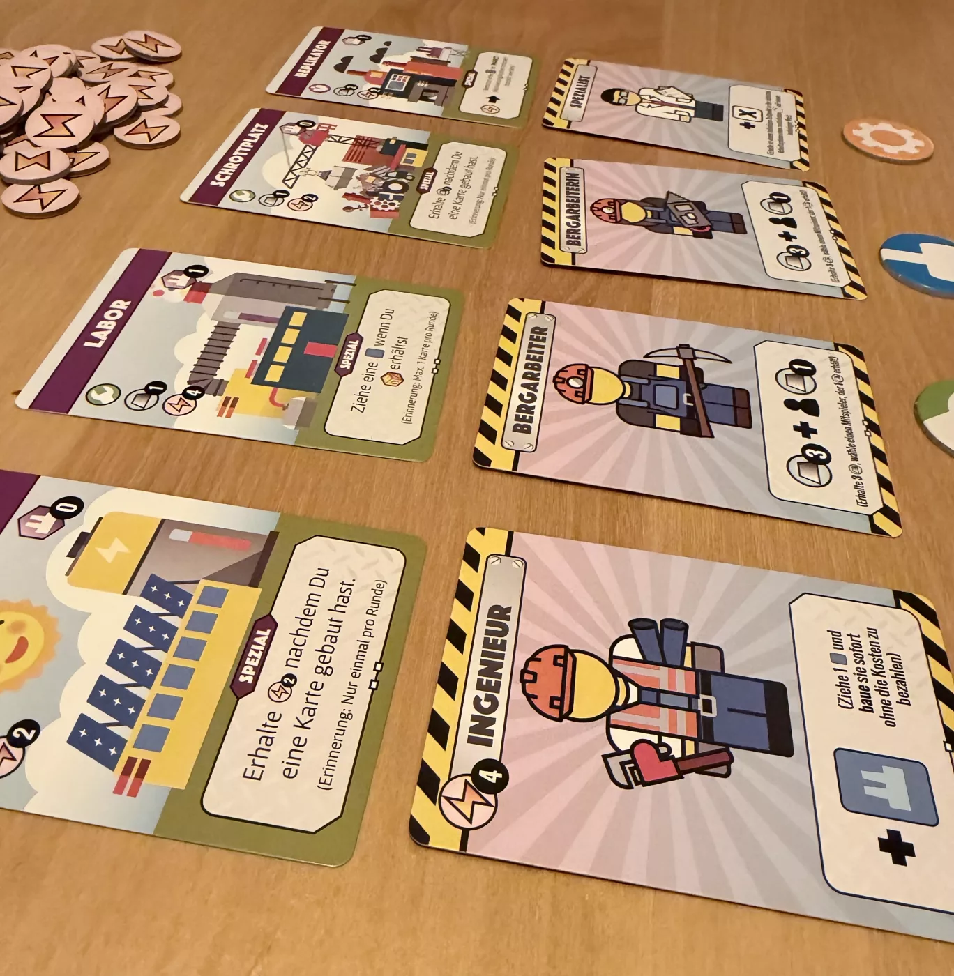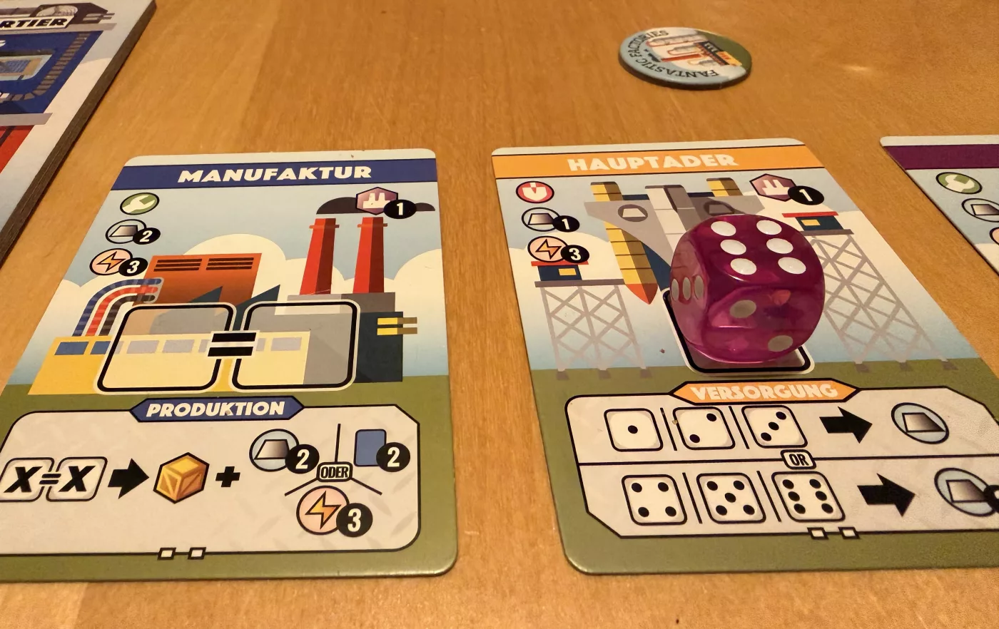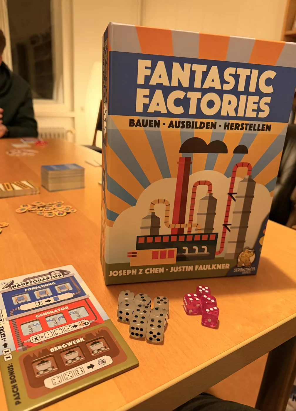 Es ist ein Wettrüsten in der Fertigung! Treten Sie gegen andere Spieler an und versuchen Sie, in kürzester Zeit die effizientesten Fabriken zu bauen. Sie müssen Ihre Baupläne sorgfältig verwalten, Ihre Arbeiter ausbilden und so viele Waren wie möglich herstellen, um die industrielle Vorherrschaft zu erlangen! In Fantastic Factories versuchen Sie, die meisten Waren herzustellen oder die prestigeträchtigsten Gebäude zu bauen. Das Spiel enthält Elemente wie Würfeln, Arbeiterplatzierung, Motorbau, Ressourcenmanagement, Tableau-Aufbau, simultanes Spielen und etwas Kartendrafting. Jede Runde ist in zwei Phasen unterteilt, die Marktphase und die Arbeitsphase. In der Marktphase kannst du entweder kostenlos einen neuen Bauplan erwerben oder gegen Bezahlung einen Auftragnehmer einstellen. Baupläne werden verwendet, um in der Arbeitsphase neue Fabriken zu bauen. Auftragnehmer können deine Strategie verstärken, indem sie dir Ressourcen zur Verfügung stellen oder dir ermöglichen, zusätzliche Würfel zu werfen. Sie müssen darauf achten, welche Karten auf dem Markt verfügbar sind und welche Strategien Ihre Gegner verfolgen könnten. Während der Arbeitsphase würfeln alle Spieler gleichzeitig und setzen ihre Würfel als Arbeiter ein, um Fabriken zu betreiben. Fabriken beginnen als Blaupausen und müssen gebaut werden. Nach dem Bau kann jede Fabrik einmal pro Runde genutzt werden. Die Arbeiter können in beliebiger Reihenfolge eingesetzt werden, und wenn Sie die richtige Reihenfolge herausfinden, können Sie eine mächtige Kette von Aktionen auslösen. Zusätzlich können Sie Ausbildungsstätten bauen, mit denen Sie die Würfelwerte Ihrer Arbeiter manipulieren können. Jede Arbeitsphase ist wie das Lösen eines einzigartigen Arbeiterplatzierungsrätsels, um Ihre Produktion von Ressourcen und Gütern zu optimieren. Sobald ein Spieler 12 Güter hergestellt oder 10 Gebäude gebaut hat, wird das Spielende ausgelöst und eine zusätzliche und letzte Runde gespielt. Der Spieler mit den meisten Punkten gewinnt (Kombination aus Gebäudeprestige und hergestellten Gütern). Mit über 30 einzigartigen Bauplänen und unzähligen Synergien zwischen den Gebäuden ist jedes Spiel einzigartig. Fantastic Factories bietet einen hohen Wiederspielwert und viel Zufriedenheit, da die Spieler mit jedem Spiel neue Fabrikmotoren entdecken. – Beschreibung des Herausgebers Für Fantastic Factories wurde auch eine große Sammlung von Solo-Rätseln erstellt, zusammen mit offiziellen Tools, um weitere zu erstellen. Diese Rätselsammlung findet sich im BGG Play-By-Forum-Bereich.