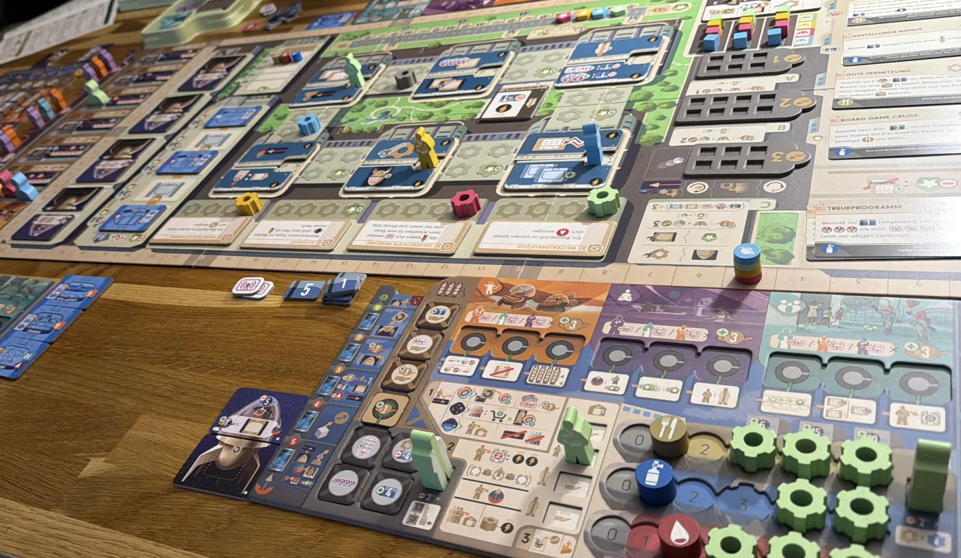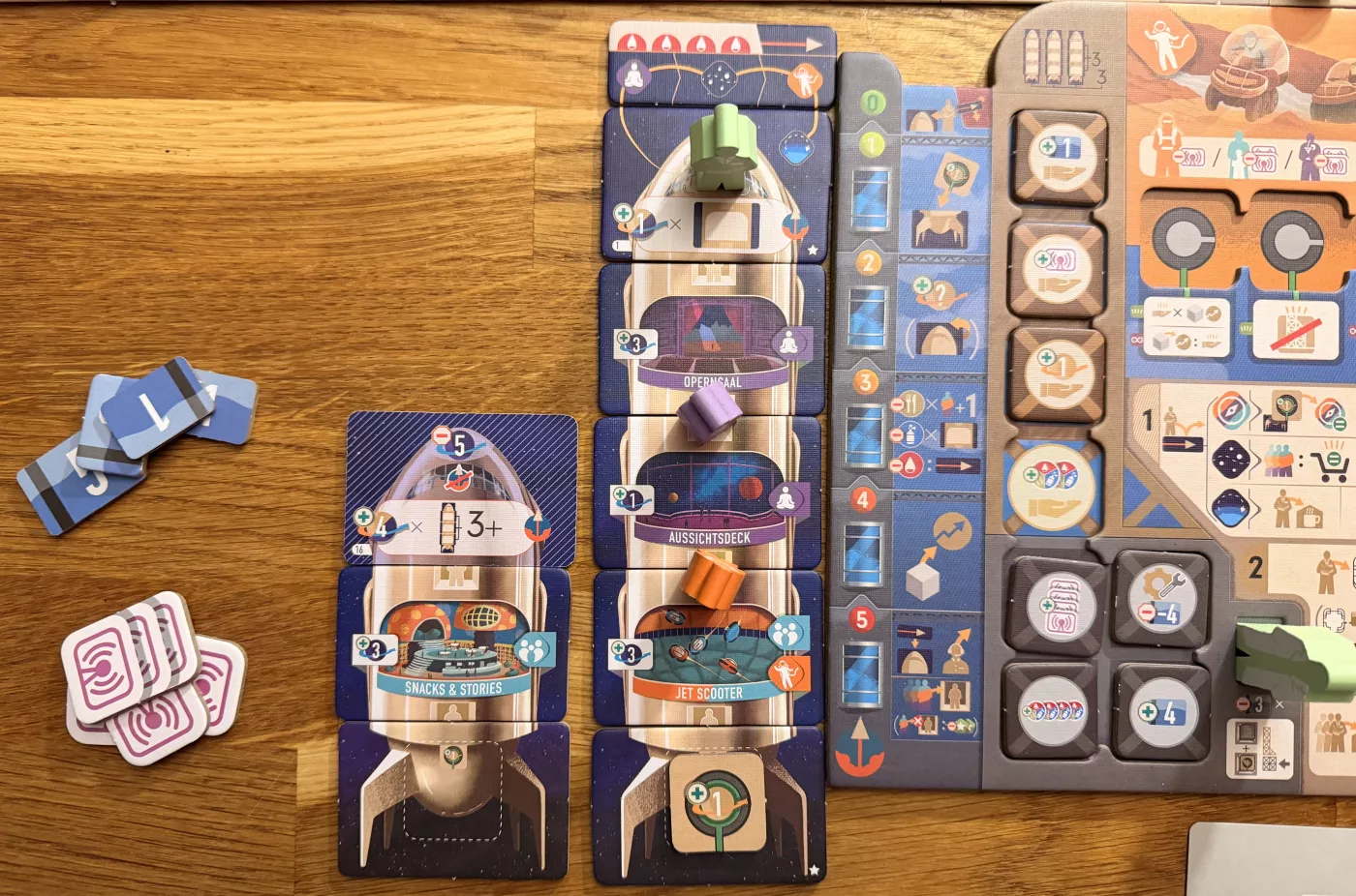 Wenn Sie an der Reihe sind, können Sie entweder einen Arbeiter einsetzen, um zwei Aktionen im ständig wachsenden Netzwerk durchzuführen, ein Schiff starten und einen Ihrer Arbeiter als Piloten ins All schicken oder alle Ihre irdischen Arbeiter zurückrufen, um Finanzierungsboni zu sammeln. Zu den Aktionen gehören der Erwerb von Bauplänen, der Bau von Schiffen, die Gewinnung von Gästen und der Bau von Verbindungen zwischen Orten, die die Auswahl an Aktionen im Laufe des Spiels erhöhen. Sie beeinflussen auch die Ressourcenmärkte, die mit den Aktionen aller Spieler schwanken.