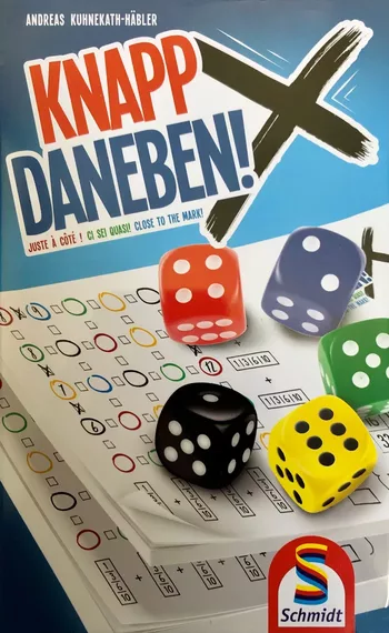 In Knapp Daneben! möchten alle Spieler Zahlen sammeln, die denen, die sie bereits haben, nahe kommen, aber nicht identisch sind. Jeder Spieler erhält einen Punktebogen und wählt eine Farbe aus den fünf farbigen Würfeln im Spiel. In einer Runde würfelt ein Spieler einmal mit allen fünf Würfeln. Jeder Spieler muss die Zahl auf seinem Würfel mit der Zahl auf einem anderen Würfel kombinieren und diese Summe dann in einen Kreis auf seinem Punkteblatt schreiben, der entweder seine Farbe oder die Farbe des anderen Würfels hat, den er verwendet. Jedes Punkteblatt enthält 25 Kreise in einem 5x5-Raster, wobei jede Farbe fünfmal vorkommt. Wenn ein Spieler eine Summe in einen Kreis schreibt, die sich von einem benachbarten Kreis um genau eins unterscheidet, markiert er das Kästchen zwischen diesen Kreisen.