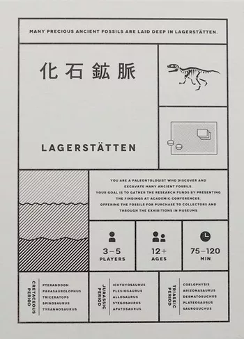 Lagerstätten, auch bekannt als 化石鉱脈, ist ein Worker-Placement-Spiel, bei dem es darum geht, Fossilien auszugraben, Fossiliensammlungen zusammenzustellen und deine Ressourcen (Geld, Ruhm) zu verwalten. Während des Spiels schickst du Arbeiter zu Aktionsfeldern, damit sie: graben können, um Gesteinsproben zu gewinnen, die Proben vorbereiten können, um die Fossilien freizulegen, einen Vortrag auf einer wissenschaftlichen Konferenz halten können, um Ruhm zu erlangen, deine Fossiliensammlung ausstellen können, um Einkommen zu erzielen.
