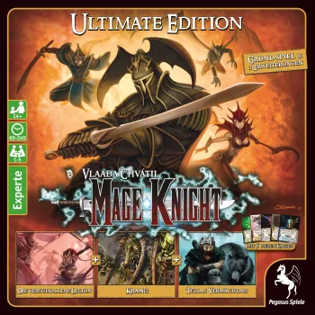 Mage Knight: Ultimate Edition contains the base game; The Lost Legion, Shades of Tezla, and Krang Character expansions; comprehensive integrated rules text; five new cards; and miniatures with alternate paint jobs.