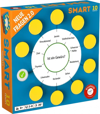 Smart 10 Family: Neue Fragen 2.0 contains 200 new questions with 2,000 new answers, with the questions covering a wide variety of subject areas appropriate for the whole family: Is the black Mamba poisonous? Do young people like to wear "long kicks"? Is "foyer" a type of cheese? And what color are Asterix's pants?