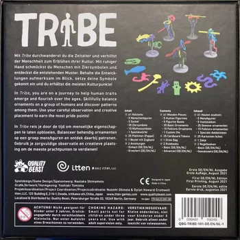 In Tribe hast du die Aufgabe, so vielen Stämmen wie möglich zu helfen, zu gedeihen und zu prosperieren. Die Spieler platzieren Ornamente auf menschliche Figuren, die in einem Kreis angeordnet sind. Diese schmücken die Figuren auf jeweils einzigartige Weise und bilden schließlich „Stämme“ mit gemeinsamen Merkmalen. Wird der Stolz der Stämme über die Jahrhunderte hinweg erhalten bleiben? Und wie wird die Menschheit jenseits der Geschichte aussehen? Die Zukunft der Stämme liegt in deinen Händen. – Beschreibung des Verlags